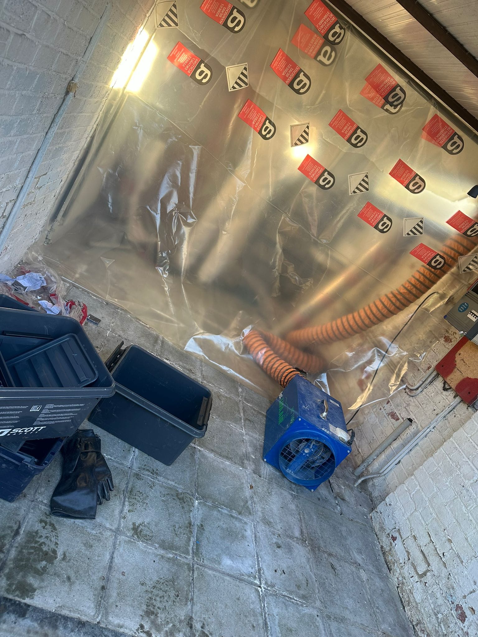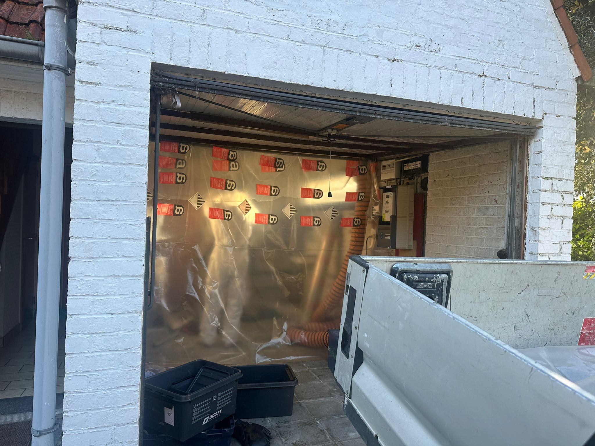 Niet hechtgebonden asbest verwijderen in een hermetische zone: Hierbij gaat het om bijvoorbeeld leiding isolatie. Enkele voorbeeldfoto’s van een asbestverwijdering door ons in een hermitische zone in Alken: